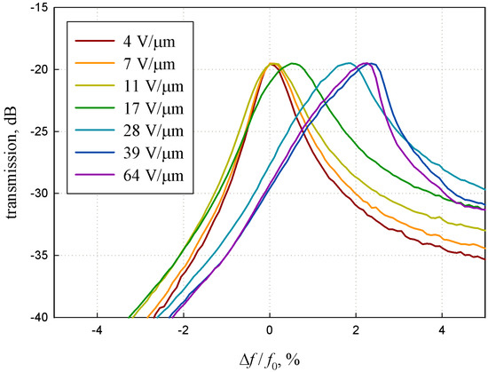 The measurements of BST capacitor response on high power MW signal were performed for the planar capacitor with a gap width of m to reach the high power density in the gap of the capacitor and, consequently, to enhance the influence of non-linear effects. The voltage-capacitance characteristic of the capacitor under test was approximated with the parameters and V and accuracy of 0.5%. The resonance characteristics of the resonator with the capacitor included under the different microwave magnitudes of the electric field strength are presented in Figure 3. For the better visual understanding the transmission coefficient was brought to one level, and the frequency shift was normalized to the resonant frequency at the small-signal microwave amplitude ( GHz at = 4 V/m). Resonance frequency variance is connected with the capacitance variance as [26], where is inclusion coefficient estimated as for the resonator used.