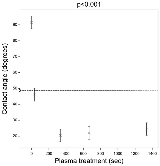 Effect of plasma treatment on the contact angle of water droplets on the surface of hot-oil modified blue-stained lodgepole pine wood. The bold X symbol on the y-axis and the horizontal dotted line indicate the contact angle of a water droplet on unmodified blue-stained lodgepole pine wood.