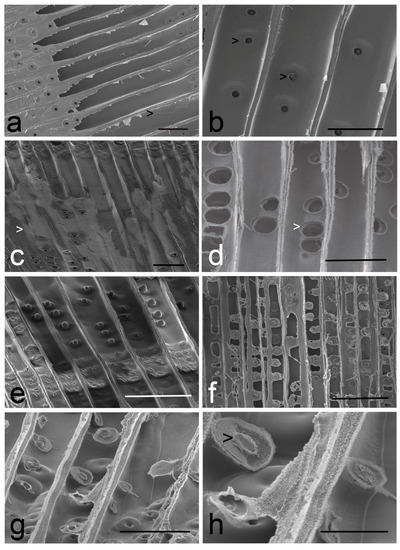 Plasma treatment of hot-oil modified wood removed deposits of oil from the surface of the wood (Figure 2e), and etched wood cell walls (Figure 2f,g), but there were differences in the etching of unmodified wood and the etching of hot-oil modified wood. In particular, the bordered pit membranes in hot-oil modified wood were resistant to plasma etching (arrowed in Figure 2h), whereas plasma completely removed pit membranes at the surface of unmodified wood (compare Figure 2f,g with Figure 2d).