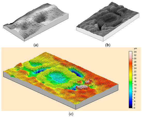 The ‘protective’ effect of hot-oil modification on plasma etching of bordered pit membranes was confirmed by confocal profilometry of hot-oil modified wood samples before and after plasma treatment. Figure 3 shows topographic images of the surface of hot-oil modified wood before (Figure 3a) and after plasma treatment (Figure 3b,c). Figure 3a shows the raised borders around two pit apertures at the surface of hot-oil modified wood. After exposure to plasma the border is etched away, as well as some of the adjacent cell wall material (Figure 3b,c). However, the central part of the pit, the pit membrane is still intact (Figure 3b,c).