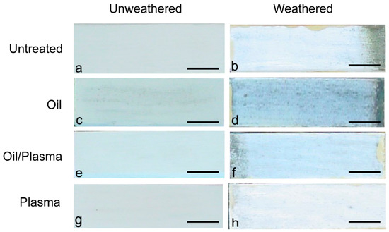 The appearance of a representative set of coated wood samples that had been hot-oil modified and/or treated with plasma, and then exposed to the weather in Vancouver for 18 months can be seen in Figure 4b,d,f,h. Unweathered controls stored in a conditioning room for the duration of the weathering trial are shown on the left-hand side of Figure 4a,c,e,g. The most obvious change in appearance of the samples during exposure to the weather is the more pronounced discolouration of the acrylic coating on the hot-oil modified wood sample (Figure 4d). Some discolouration of the ends of most weathered samples occurred where they were covered with glass strips used to fix them to weathering racks.
