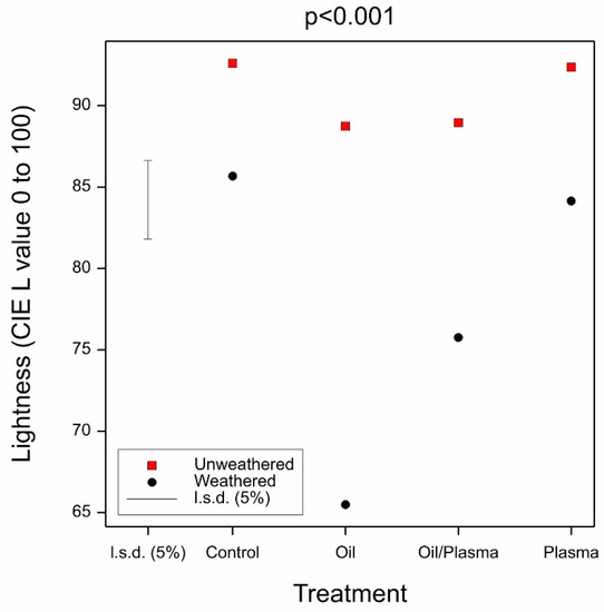 The edges of coated samples were sealed using two-part epoxy resin (G2, Industrial Formulators of Canada Ltd., Burnaby, BC, Canada). The samples were then placed on glass backing plates (750 × 120 mm) and secured against the glass plates by clamping the edges of the samples between two glass strips using alligator clips. Samples were exposed to the weather on a rack inclined at 45° to the vertical and facing south in Vancouver, BC, Canada for a period of 18 months. A matching set of samples was kept in a conditioning room for the duration of the weathering trial. After the weathering trial, samples were removed from the weathering rack, and kept in a conditioning room for one week. The CIE L value (lightness on a scale of 100 (white) to 0 (black)) of the white acrylic paint was measured in the middle of each sample using a spectrophotometer (CM-2600d, Minolta Co. Ltd., Osaka, Japan) [33]. The water absorption of coated samples (weathered and controls) was measured as follows. Samples were weighed using an analytical balance (AAA 300L, B.C. Scale Co. Ltd., Vancouver, BC, Canada) and a 100 µL droplet of distilled water was placed on each sample using a single-channel pipette. After 60 s, the water droplet was wiped off the surface of the sample with soft paper tissue and the sample was re-weighed. The weight of water absorbed by the surface was calculated as described by Kiguchi and coworkers and expressed as the ratio of weight of water absorbed by weathered samples to that of unweathered controls [34]. Analysis of variance was used to assess the effects of hot-oil modification and/or plasma treatment and exposure to natural weathering on CIE L value and water absorption. Lightness results are presented in a graph and an error bar (Fisher’s least significant difference, LSD) on the graph can be used to estimate whether differences between individual means are statistically significant at the 5% level (p < 0.05) [31].