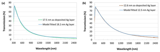 Transmission spectra of thin Ag layers deposited onto clear glass substrates plotted with the best-fitted modeled transmission spectra of corresponding film layers: (a) 17.5 nm as-deposited Ag layer; and (b) 12.6 nm as-deposited ultra-thin Ag layer.