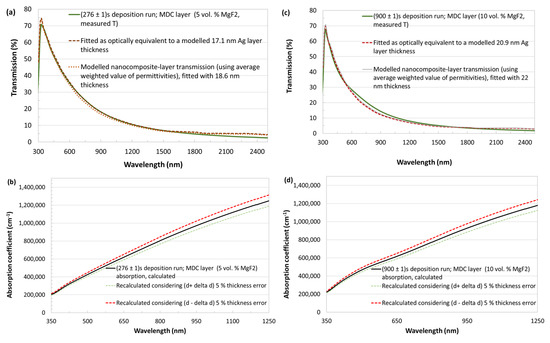 Figure 4 presents examples of MDC layer physical thickness determination through the optical transmission spectra fittings with the modeled transmission spectra. Figure 4 also shows the calculated absorption coefficients of the MDC layers having different volumetric content of MgF2 dilution into the metal-dielectric composite matrix. The measured transmission spectra of MDC layers were used to calculate the absorption coefficient spectra of the as-deposited MDC layers by using a simple formula, defined as T = exp [−α(λ)d], where α is the absorption coefficient, T is the transmittance (in percentage), and d is the thickness of the films [47,48]. The absorption coefficient of the MDC layers was found to be very similar to that of pure-Ag layer. The absorption coefficient of the MDC layers is presented with its calculated upper and lower limits (considering having up to about 5% error in the final film-layer thickness determination). All of the as-deposited MDC layers showed similar trends of the wavelength and film-thickness dependent absorption coefficients. More transmission fitting and absorption coefficient calculation results are provided in the Supplementary Section (Figures S3 and S4).