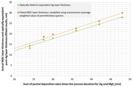 Plot of best-fitted MDC layer thicknesses and the optically equivalent fitted thicknesses of pure Ag layers.