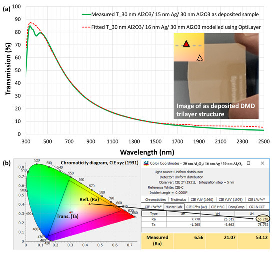 Optical and color chromaticity properties of Al2O3/Ag/Al2O3 multilayer building block; (a) measured transmission spectrum plotted with the best-fitted simulated transmission spectrum; the figure legend shows the physical thickness of each particular layer, the inset of the figure shows the simulated color point of film area that matched with the color of the as-deposited trilayer films, (b) shows the Chromaticity diagram (CIE xyz 1931) obtained for the same Dielectric/Metal/Dielectric (DMD) structure using OptiLayer Pro together with the Hunter L, a, b (measured and simulated) values.