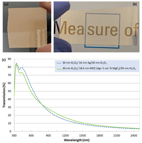 Visual color appearance and optical transmission properties of MDC-based DMD trilayer structure compared to those of pure Ag layer-based DMD trilayer; (a) an image of an as-deposited pure Ag layer-based DMD structure, (b) photo of an as-deposited MDC-based trilayer structure, and (c) measured transmission spectra of DMD trilayer structures (pure Ag, and MDC based).