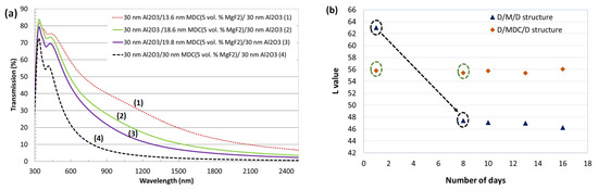 From the obtained results, it can be concluded that it is possible to fabricate multilayer structures using a slightly thicker MDC layer (compared to pure Ag option) without changing the design-targeted optical and chromaticity properties (as confirmed by the optical transmission spectra of Figure 7c and the L values for the structures 30 nm Al2O3/16 nm Ag/30 nm Al2O3 and 30 nm Al2O3/18.6 nm MDC/30 nm Al2O3). Figure 8a shows the measured optical transmission spectra of several MDC-based as-deposited trilayers where the MDC layer thickness varied from 13.6 to 30 nm. The obtained spectral shapes show that the thicker the middle MDC layer, the higher is the IR reflection and also the higher the values of L. Higher L values confirm the increased brightness (visual apparent color of the coatings being closer to white). We have experimentally tested the color stability of the MDC-based coatings compared to the coatings based on pure Ag. We have selected two structures (30 nm Al2O3/16 nm Ag/30 nm Al2O3, and 30 nm Al2O3/18.6 nm MDC/30 nm Al2O3) to investigate the stability of the color values by way of measuring the color values on different days, during a lab storage test. The color stability test results obtained are presented in Figure 8b. It can be seen that the L value of the pure Ag layer-based structure has changed drastically within the first seven days after the deposition, while the MDC-based coating structure showed a minimal change in the measured L values. We have also noted that the Hunter a and b values in both trilayer types did not show significant changes on the same time-scale.