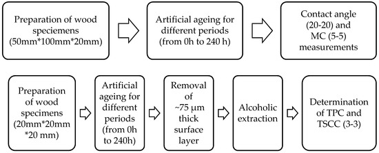 Before ageing, all wood surfaces were sanded with sandpaper of grit size 150. From the different wood species similar samples were prepared for different measurements, including the specimens for contact angle and moisture content examinations from different boards with dimensions 50 × 100 × 20 mm3 and specimens for total phenol and total carbohydrate content measurements with dimensions 20 × 20 × 20 mm3.