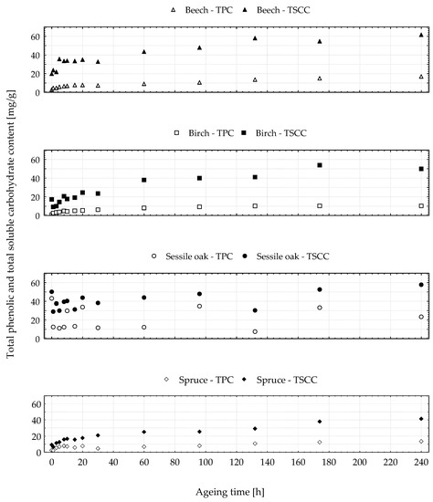 Total phenolic and total soluble carbohydrate contents as function of artificial ageing.