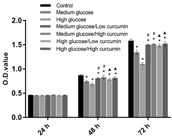 Effects of curcumin on viability of MC3T3 cells in high-glucose conditions. Cell viability was measured using the CCK8 assay after culturing for 24, 48, and 72 h, separately. The bar chart shows the mean optical density (OD) values (n = 3). *p < 0.05 vs the control group; #p < 0.05 vs the medium glucose group; ▲p < 0.05 vs the high-glucose group.