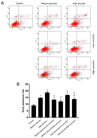 Effects of curcumin on apoptosis of MC3T3 cells in high-glucose conditions. Cell apoptosis was assessed by staining the cells with Annexin V-FITC/PI double staining kit and subsequent analysis by flow cytometry. (A) Detection of the early apoptosis rate of MC3T3 cells using flow cytometry. (B) The bar chart shows the mean of early apoptosis rate (n = 3). *p < 0.05 vs the control group; #p < 0.05 vs the medium glucose group; ▲p < 0.05 vs the high glucose group; and &p < 0.05 vs the high glucose/low curcumin group.