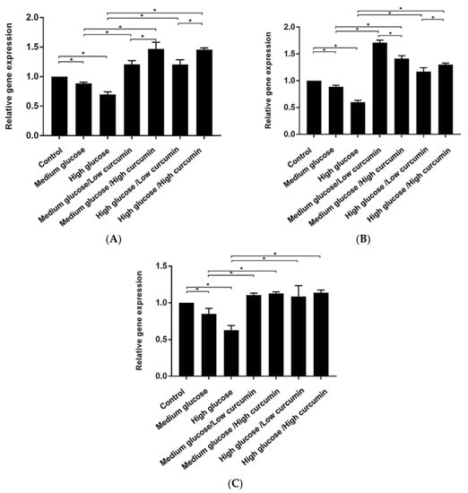 GraphPad Prism 5.0 software (San Diego, CA, USA) was utilized to perform statistical analysis. The quantitative data were depicted as mean ± standard deviation (n = 3). One-way ANOVA and multi-way ANOVA were used to calculate the statistical significance among glucose-treated groups and curcumin-treated groups, respectively. Statistically significant differences between each two groups at each time point were evaluated using the t-test. A p value of less than 0.05 was considered statistically significant.