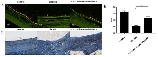 The present study evaluated cortical and cancellous bones by fluorescent double-labeling and Masson staining, respectively. The results revealed that significant differences in alveolar bone loss were observed in curcumin-treated groups when compared with diabetic mice. A general observation from fluorescence images (Figure 4A) was that curcumin treatment significantly enhanced alveolar cortical bone continuity and thickness when compared to diabetic mice, which was similar to that of non-diabetic mice. A general observation from Masson staining (Figure 4C) was that curcumin treatment extremely enhanced alveolar cancellous bone density and mineralization in diabetic mice, which is similar to that of non-diabetic mice. Curcumin treatment significantly enhanced the trabecular bone formation rate compared to diabetic mice (1.60 ± 0.11 um/d (diabetic) vs. 0.55 ± 0.05 um/d (curcumin), p < 0.05), and there was no significant difference observed when compared to the non-diabetic group (1.18 ± 0.11 um/d (non-diabetic)) (Figure 4B). These results show that curcumin treatment could improve alveolar bone structure in diabetes, and this is in agreement with the results of osteogenesis of MC3T3-E1 cells in response to curcumin treatment in vitro.