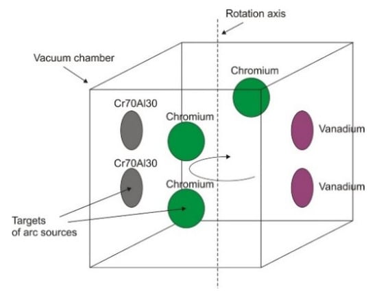 Schematic presentation of location of Cr, V and Cr70Al30 targets within the vacuum chamber of the arc deposition system.
