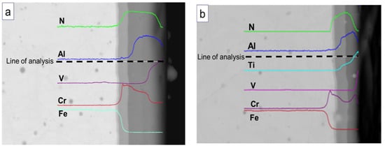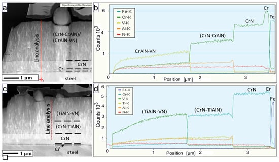 The SEM image acquired in Back Scattered Electrons (BSE) mode presenting cross-section of the hybrid processed tool steel, i.e., a nitrided base material covered with multilayer protective coatings, showed that deposition of the Cr/CrN buffer double layer secured formation of a non-porous interface between them (Figure 3). The SEM/EDS profiles documenting distribution of elements across the Cr/(CrN)/nx(CrN/CrAlN)/mx(CrAlN/VN) coating confirms stepped decrease of Cr concentration from bottom to top as well as partial substitution of Al with V in the near surface area (Figure 3a). The EDS profile obtained from Cr/(CrN)/nx(CrN/TiAlN)/mx(TiAlN/VN) coating shows roughly the same stepped relation as it concerns the diminishing concentration of Cr (raised Cr intensity is an artifact due to superposition of Cr-Kα with V-Kβ lines) as well as raising concentration of V in the near-surface area (Figure 3b). The surface of the multilayers was found to be decorated with droplets of sizes starting from tens of nanometers and ending in micrometer range.