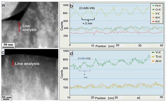 The STEM/HAADF microstructure images helped to establish that coatings are built of pseudo-columnar grains and the droplets observed previously on the coatings surface are also present within them (Figure 4a,c). The EDS profiles are characterized by lowering number of acquired counts when approaching the surface of the coating due to reduced thickness of the TEM lamellas in such areas (Figure 4b,d). The EDS signal acquired from the Cr/(CrN)/nx(CrN/CrAlN)/mx(CrAlN/VN) coating documented high chromium concentration in the first buffer layer and its lowering in CrN and the following stacks of nitride/nitride multilayers (Figure 4b). In the case of the Cr/(CrN)/nx(CrN-TiAlN)/mx(TiAlN-VN) multilayer the situation is similar with an exception of much smaller difference between counts from Cr and CrN caused by oversaturation of the EDS detector due to large foil thickness. Simultaneously, the diminishing concentration of chromium is substituted first by aluminum starting at the middle of the multilayer and, later, also by vanadium located closer to the surface parts. The activation of the aluminum arc target is accompanied by a strong local enrichment of multilayer in this element, i.e., its concentration rises above the average for the CrN/CrAlN or CrN/TiAlN stack. However, a switching on of Ti or V targets proceeds through gradual approaching to the average concentration of the involved elements. As it took place during SEM/EDS measurements, the presence of a false chromium signal within the most top TiAlN/VN results from a superposition of vanadium and chromium lines, i.e., V-Kβ is taken for Cr-Kα (Figure 4d). The STEM/EDS profiles obtained at higher spatial resolution from the near-surface area helped to differentiate the multilayer character of this coating using vanadium signal (Figure 5). The complementary changes of Al and Ti concentration were weaker but still evident, while changes in Cr in that area were too noisy to ascribe them to any specific set of nanolayers (the same situation was with the signal from nitrogen, which was therefore omitted from both graphs). The contrast variation seen in STEM/HAADF images and the changes in STEM/EDS signal strength helped to determine the characteristic parameter of the coatings as given in Table 2.