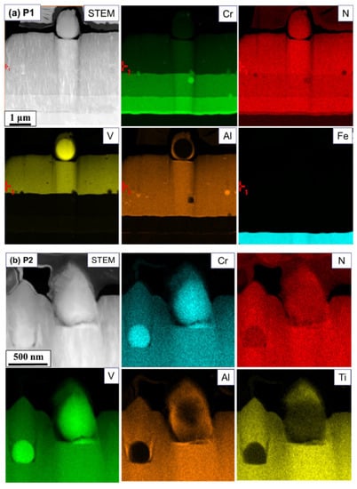 Images of cross-section of P1 (a) and P2 (b) hybrid coatings with accompanying EDS maps presenting distribution of Cr, Al, Ti, V, N.
