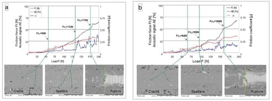 Results of scratch tests of the P1 and P2 coatings are presented in the Figure 7. The SEM observations of the path covered by Rockwell indenter helped to establish that in both coatings the first microcracks denoted as the Fc1 show up at a distance corresponding to ~60 N. Up to that loading, also the friction coefficient remains practically negligible for both coatings. The measurements of accompanying acoustic emission from the P2 coating gave couple of sound pulses clearly above the noise level indicating that in this case the value of Fc1 could be half of this determined through SEM observations. Applying the force exceeding 60 N caused a development of series of evident adhesive cracks accompanying by steadily raising friction coefficient as well as a series of acoustic emission pulses of medium strength in both the P1and P2 coatings. Only after the load on the indenter reached the values of ~130 N or ~100 N for the P1 and P2 coating, respectively, the scratch path showed first signs of removal of small parts of the coatings visibly, both at the bottom of the indenter path and at their edges (the value of the second critical force is marked as Fc2). The above processes continue till the 160–170 N at which a total removal of the coating from under the indenter starts, followed by a steep raise in friction force as well as multiple strong acoustic pulses.
