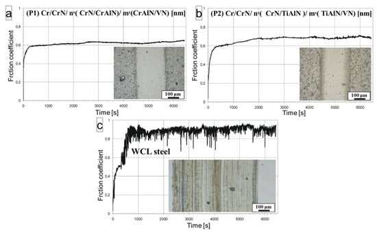 The wear test of the P1 and P2 multilayer coatings, done in a ball-on disc stand at ambient temperature, showed that the tracks forming as a result of ball action have smooth edges, sides and bottom (Figure 8). The brighter spots within the wear track represent droplets cut by the passing ball, while the darker ones represent holes left by broken out droplets. The friction coefficients are similar for both coatings, even if this for the P2 coating was slightly higher than for P1 throughout most of the test, i.e., ~0.7 against ~0.6, respectively. The wear track on reference nitrided WCL steel was not only significantly wider after comparable times, but also bears the marks of deep groves along it. As a consequence of the above, the friction coefficient measured for this sample was not only the highest but also showed frequent instabilities. The quantitative assessment of the wear test helped to establish that, as compared with the reference plasma nitrided tool steel, the P1 and P2 multilayer coatings present ~100 times and ~200 times better wear resistance, respectively (Figure 9).