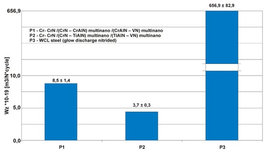 Wear resistance of P1, P2 multilayer coatings and reference nitrided tool steel.