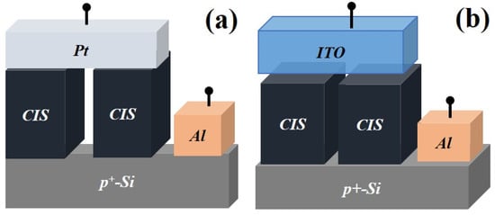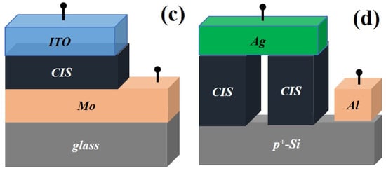 In this study, hetero-junction devices with four different structures were investigated, as shown in Figure 1. We first took Pt/CIS-NRs/p+-Si (Figure 1a), which used Pt as upper electrode, and we found that the Pt/CIS-NRs contact formed the ohmic contact rather than the Schottky contact. The other structures were ITO/CIS-NRs/p+-Si (Figure 1b), ITO/CIS-TF/Mo/glass (Figure 1c), and Ag/CIS-NRs/p+-Si (Figure 1d), respectively. We demonstrated that the three devices revealed the characteristics of a Schottky diode, and their current–voltage properties depended on the contact electrode and the structure of CuInSe2 nanomaterials.