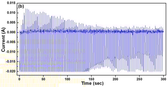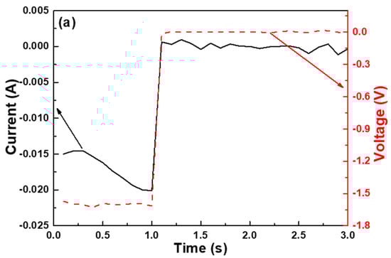 CuCl2·2H2O (≥99%, Sigma-Aldrich, St. Louis, MI, USA), InCl3 (99.99%, Alfa Aesar, Ward Hill, MA, USA), H2SeO3 (98%, Sigma-Aldrich), LiCl (99%, Alfa Aesar), and dimethyl sulfoxide (≥99%, DMSO, J.T. Baker) were used as the source solutions to deposit the CIS films and CIS nanowires. The potentiostat was used to provide the stable pulse voltage source with constant electric potential for the electrodeposition of nano-structured CIS materials. The p-Si substrates, Pt-Ti net, and reference (saturated calomel) electrode formed the three-electrode electrodeposition system. AAO was used as the template when the CIS-NRs were deposited. The solution included CuCl2 1.5 mM, InCl3 25 mM, and H2SeO3 3 mM, where LiCl 0.7 M was added to enhance the conductivity of the solution and DMSO 0.1 M was used as a surface modifier. The DMSO was used to coat the surface of the AAO template to reduce its surface polarity, caused by the positive charge, to enhance the process of filling the hole. The optimum electrodeposition parameters were of a duty cycle of 33% (Ton = 1s and Toff = 2 s), deposition temperature of 35 °C, pH value of 1.5, deposition voltage of −1.6 V, and deposition time of 5 min. Figure 2a shows the variations of current and voltage during the first cycle and Figure 2b shows the variation of current during the whole deposition process (0~300 s), respectively. They show that the deposition process was a pulsed electrodeposition with a duty cycle of 33%.