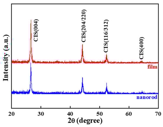 Figure 3 shows the diffraction characteristic peaks of the deposited CIS films and nanorods. Diffraction peaks at 2θ values of 26.61°, 44.20°, 52.32°, and 64.34°, which correspond to the diffraction planes of (112), (220/204), (312/116), and (400), were observed for the CIS phase. As the XRD pattern in Figure 1 shows, the diffraction intensity of the CIS films was higher than that of the CIS-NRs. In addition, the full width at half maximum (FWHM) value of the (004) plane for the CIS films was smaller than that of the CIS-NRs. There are two reasons why the diffraction intensity of the CIS films was larger than that of the CIS-NRs. The first is that the crystallization of the CIS films is better than that of the CIS-NRs and the second is that the effective diffraction surface of the CIS films is larger than that of the CIS-NRs. Because the FWHM value of the CIS films is smaller than that of the CIS-NRs, we believe the better crystallization of the CIS films is the main reason for the difference in the diffraction intensities of CIS films and the CIS-NRs. However, both the deposited CIS films and the CIS-NRs have high crystallization for further applications of devices.