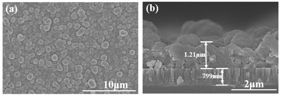 SEM images of the deposited CIS films: (a) surface and (b) cross-section observations.