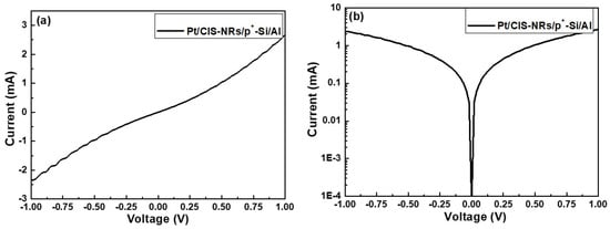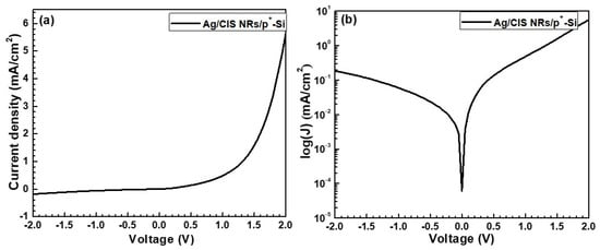 Finally, Ag was used as the electrode to form the Ag/CIS-NRs/p+-Si structure, and its J-V characteristic was also measured. The ΦAg was 4.26eV, which was smaller than the ΦCIS value and the Ag/CIS-NRs/p+-Si device formed the Schottky diode. Figure 9a,b shows the normal scale and log scale, respectively. For the Ag/CIS-NRs/p+-Si device, when +1 V and −1 V were used as the standard to measure the current densities, the forward and reverse current densities were 0.48 mA/cm2, −0.06 mA/cm2, respectively, and the on/off ratio was 8.07. These results show that interface of the Ag/CIS-NRs was a Schottky contact and the Ag/CIS-NRs/p+-Si device acted as a Schottky diode.