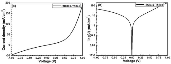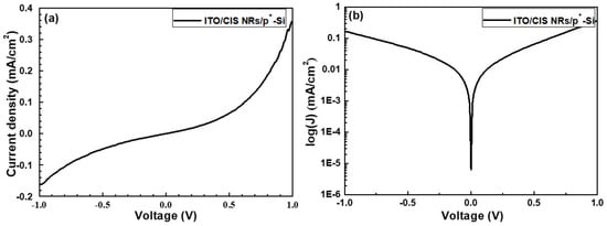 The J-V curves of the ITO/CIS-NRs/p+-Si device are shown in Figure 7a,b for the normal scale and the log scale, respectively, which shows that the J-V curves were not symmetrical. When +1 V and −1 V were used as the standard to measure the current densities, the forward and reverse current densities were 0.35 mA/cm a and −0.165 mA/cm2, respectively, and the on/off ratio was 2.12. These results suggest that the interface of the ITO/CIS-NRs is a Schottky contact and the ITO/CIS-NRs/p+-Si device can act as a Schottky diode. For the ITO/CIS-TF/Mo device, when +1V and -1V were used as the standard to measure the current densities, the forward and reverse current densities were 189.3 mA/cm2 and −47.51 mA/cm2, respectively. Figure 8a,b shows the normal scale and the log scale, respectively, and the on/off ratio for these scales was 3.98. These results also suggest that the interface of ITO/CIS-TF is a Schottky contact.
