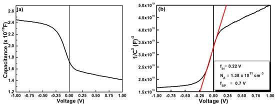 In this study, the Ag/CIS-NRs/p+-Si diode had the larger on/off ratio, therefore its C-V characteristic was also measured and the results are shown in Figure 10a, and the relationship for 1/C2-V is shown in Figure 10b. The 1/C2 can be used to find the built voltage (Vbi) of the Ag/CIS-NRs/p+-Si diode, and the Equation for the relationship between 1/C2 and Vbi is shown in Equation (1). Because the slope shown in Figure 10b is positive, this shows that the CIS-NRs is a p-type semiconductor. From the extrapolation line of the slope, the Vbi can be found at the intercept of the slope and voltage axis, and Vbi is 0.22 V. The parameter  was used to measure  and was obtained from [], where  =  = 8.85 × 10−14 × 13.5 F/cm = 1.19475 × 10−12 F/cm and Nv = 1.5 × 1019 cm−3. The relationships to find the Schottky barrier (ΦSH) and the carrier concentration (NA) of the CIS-NRs can be expressed in Equations (2) and (3). When we brought  = 0.22V into Equations (2) and (3), the calculated ΦSH value was 0.7 V and the calculated NA value was 1.38 × 1011 cm−3.
