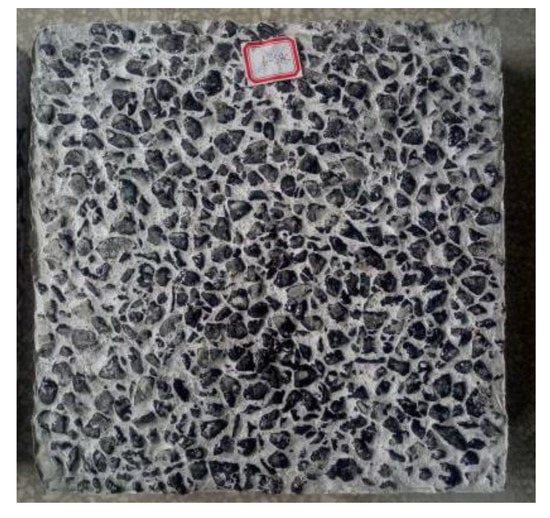 Step 3: Pour the prepared cement grouting material into the prepared testing slab of the matrix asphalt mixture with the help of mini plate vibrator until the cement grouting material overflows. Scrape away redundant cement grouting material using the mini rubber scraper. Finally, the test sample of the semi-flexible material can be obtained after curing, as shown in Figure 2.