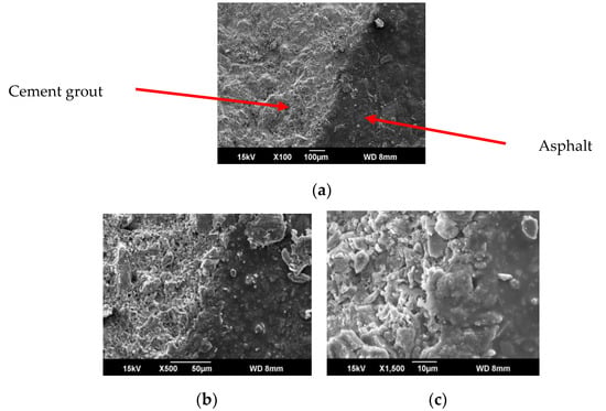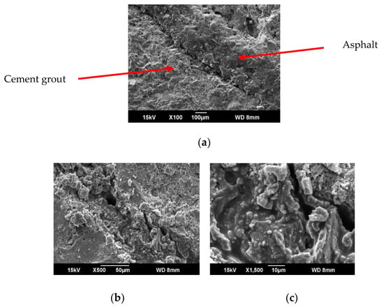 Microstructure of cement-asphalt interface modified by silane coupling agent with different sizes: (a) 100 μm; (b) 50 μm; (c) 10 μm.