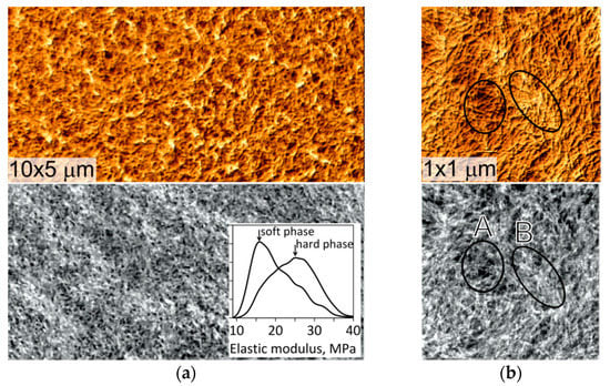 Atomic force microscope (AFM)-images of the relief (top row) and elastic modulus (bottom row) of the raw polyurethane surface on the scale (a) 10 by 5 µm and (b) 1 by 1 µm. An insert on (a) shows the distributions of the elastic modulus corresponding to areas of high concentration of soft (region “A” in Figure 2b) and hard (region “B”) phases of the polyurethane.