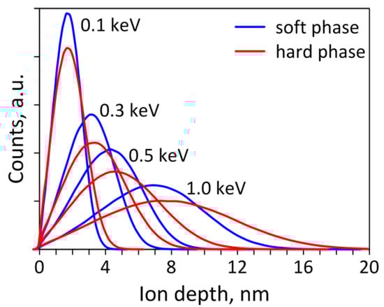 The implantation depth of carbon ions was estimated using a Trim software []. The sizes of structural–mechanical inhomogeneities of the surface are from units (thickness of fibrils) to hundreds of nanometers (agglomerates). Therefore, it is reasonable to perform the calculations separately for the hard and soft phases (the chemical structure is presented in Figure 1). The results of the simulation (Figure 3) show that carbon ions penetrate deeper into the hard phase than into the soft phase. Therefore, the concentration of the implanted carbon in the unit volume of the soft phase is higher. This difference increases as the energy of ions rises.