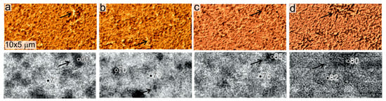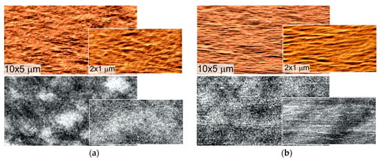 The reliefs of stretched surfaces at U ≤ 0.3 keV are similar: Carbon-modified agglomerates of the hard phase are oriented along the axis of deformation (Figure 9a); identical AFM images of such surfaces are not presented.