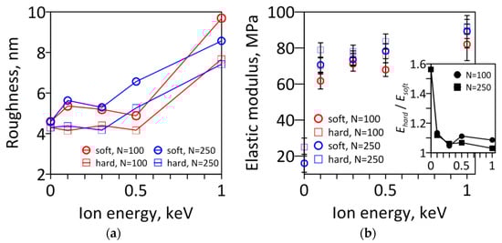Roughness of the modified soft phase of the PU rises as the energy of ions increases (Figure 6a). In these areas (highlighted by arrows in Figure 4), local wrinkles start to form at the lowest energy of ion implantation. When the energy of ions reaches 1.0 keV, the entire surface of the material is covered with a chaotic wrinkled structure. The roughness of the modified hard phase does not change significantly up to the energy of 0.5 keV (Figure 6a), and then increases due to the wrinkling. Note that the wrinkles of the hard phase after 250 impulses of ion implantation are formed at 0.5 keV (see Figure 5c), but for N = 100 the higher energy is required (Figure 4d).