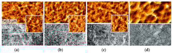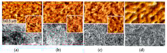Ion implantation breaks almost all fibrillar structures of the hard phase. Only separate filaments of the hard phase are yet visible if U < 1.0 keV (Figure 7a–c, Figure 8a–c). As energy of ions reaches 1 keV, the traces of the phase separation disappear (Figure 7d, Figure 8d). On the nano-scale (see inserts in Figure 7 and Figure 8) at U ≤ 0.5 keV, mesh-like nanostructure covers the surfaces. In the literature, one can find analogues of similar structures formed at the initial stage of carbon-like coating growth []. A height of cell walls is 0.4–0.6 nm, the size of cells is 10–20 nm. Qualitative analysis established the growth of mesh size as energy of ions increases.