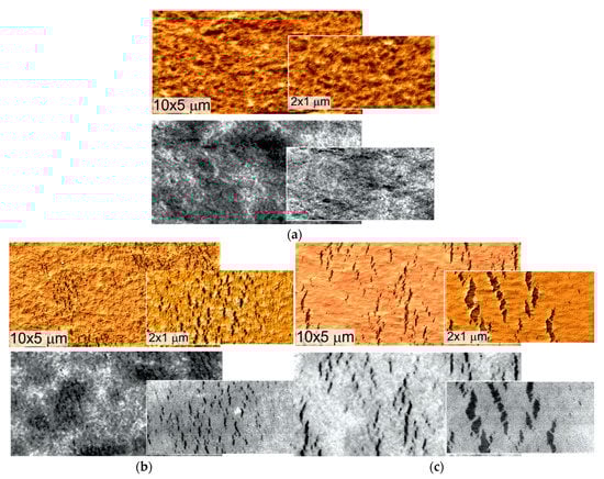 Submicron cracks are formed in soft areas of the stretched surface of the material treated with 0.5 keV and N = 100 (Figure 9b). The increase of energy to 1 keV leads to coalescence of cracks and increase of their width (Figure 9c), i.e., the fracture starts at lower critical tension. The average depth of cracks is 15–20 nm, that is more than the depth of ion implantation: High local strain (indicated by polymer strands connecting the crack edges, see Figure 9c) of the PU ruptures soft phase at the bottom of the cracks.