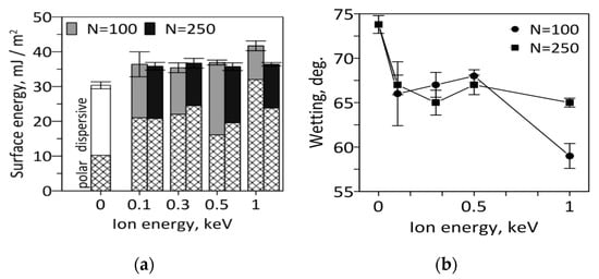 The treated materials have an increased free surface energy (Figure 11a). The growth is due to the polar component of the energy (characterizes dipole interactions and energy of hydrogen bonds), that should have a positive effect on the sorption activity of proteins []. Besides, low surface hydrophilicity is important for many biomedical applications (Figure 11b) []. It correlates with the polar energy component and maximal for U = 1 keV and N = 100, however, this material showed the worst deformation behavior.