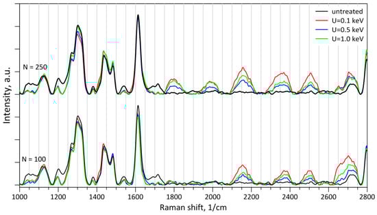 The peaks in the frequency range >2300 cm−1 correspond to graphene-like structures [,,]. The intensity of these peaks is higher at lower energy of ions. In this regime the carbon atoms have especially low implantation depth and, therefore, concentrate in a narrow surface layer forming single or stacking [] graphene-containing structures: The monolayer of graphene [] or disordered graphene [] having sharp peaks at 2500 and 2700 cm−1, graphene-oxide characterized by increased intensity at 2500–2700 cm−1 [], and the G-peak (~1600 cm−1) of carbon is masked by the polyurethane. The mesh-like surface nanostructure (Figure 7a–c, Figure 8a–c) could be the direct evidence of such formations. Note, that more precise analysis is complicated due to heterogeneities of the original substrate and the modified surface layer. As the energy increases, the distribution of carbon ions over the depth broadens that decreases the intensity of graphene.
