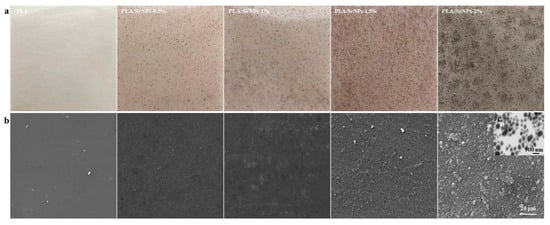 Figure 2a shows images of the composite films with different compositions, and Figure 2b shows the SEM micrographs of the corresponding films. The surfaces of the PLA present a continuous microstructure, which smooth and homogeneous, without holes or cracks. The PLA/SeMP composite membranes have no cracks, air bubbles, droplets and pores. Changes in the morphology of the PLA/SeMP membranes were significant compared to those noted for the PLA membranes. The surface of pure PLA was smooth and dense, while the surface of the PLA/SeMP membranes showed a slightly rough texture and the nanoparticles were distributed in the PLA matrix. The surface roughness arose from the SeMP molecules disrupting the compact structure of the PLA matrix. As the concentration of SeMP increased, the surface roughness of the membranes increased. As the SeMPs were dispersed in the chloroform solution for PLA dissolution without any surface treatment, the SeMPs appeared on the surface of the membrane. When the dosage was less than 1.5%, the distribution of nanoparticles was more uniform. Particle agglomeration occurred when the dosage of nanoparticles was increased further. Similar events have been reported in the previous literature []. To determine the morphology of SeMPs in the polymer, TEM was performed, and the microstructure images of the PLA/2% SeMP films are presented in Figure 2c. As seen in the figure, SeMPs were randomly distributed in the PLA matrix. At this concentration, the SeMPs began to agglomerate, corresponding to our intuitive assumption.