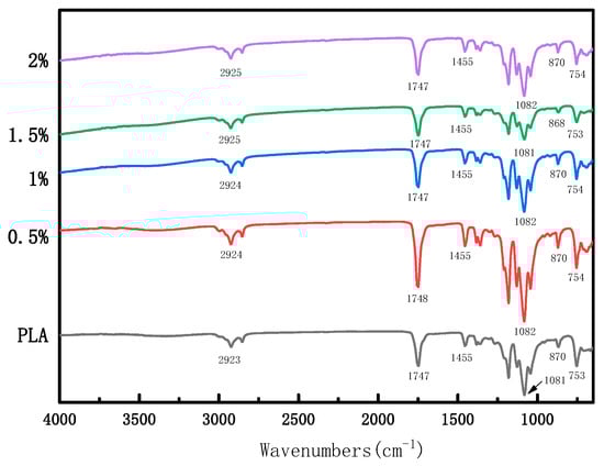 FTIR spectrum is an effective technique to research the interaction between functional groups based on the vibrational band shifts. Further characterization of the PLA and PLA/SeMP composite membranes was done by applying FTIR spectra. The band of PLA at 2923 cm−1 represents the asymmetric stretching vibration of CH; the band at 1747 cm−1 represents the stretching vibration of C=O; the band at 1455 cm−1 is the bending vibration in the s-CH(CH3) plane; the peak value at 1081 cm−1 stands for C–O stretching vibration and the peak values at 870 cm−1 and 753 cm−1 represent C–C stretching vibrations. Based on analysis of the spectra obtained for PLA, PLA/SeMPs, and SeMPs (Figure 3), the FTIR spectra of the membranes with or without nanoparticles showed similar general characteristics. There was no indication of chemical interactions between PLA and the SeMPs. No supplemental peak formation was observed, suggesting that no chemical bonds were formed between the PLA and SeMPs. This suggests that SeMPs were physically trapped within the polymer matrix, in agreement with the previously discussed results [,].