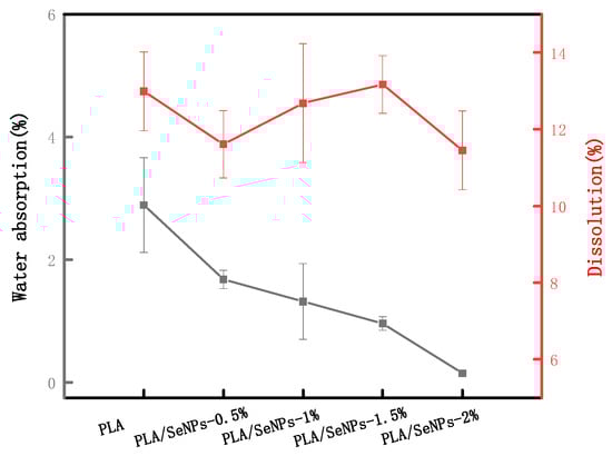 The swelling capacity and solubility are very important factors for membranes, affecting their water resistance, especially in humid environments []. As shown in Figure 4, the PLA membranes were characterized by a higher swelling capacity than that of the PLA/SeMPs composite membranes. The addition of SeMPs significantly (p < 0.05) reduced the swelling degree of the membrane in water. This may be because the SeMPs molecules entered the PLA molecules and blocked many gaps between the PLA molecules, so that water molecules could not enter these gaps and be adsorbed []. When the mass fraction of SeMPs was 2%, the swelling rate of the composite film was 0.15 ± 0.01%, which was the lowest, and 94.81% lower than that of PLA membrane.