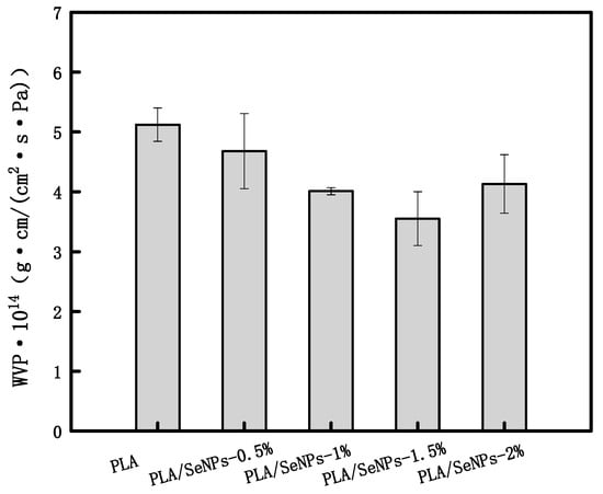 The WVP of the PLA and composite membranes is shown in Figure 5. The WVP of the pure PLA was 5.12 × 10−14 g·cm/cm2·s·Pa. The WVP first decreased at low SeMP concentrations (below 1.5%) and then increased with further addition of SeMPs. The WVP of the pure PLA was always higher than that of PLA/SeMP composite membranes. The PLA/1.5%-SeMP composite membrane showed the lowest WVP of 3.55 × 10−14 g·cm/cm2·s·Pa, which is 30.6% lower than that of the pure PLA. This may be due to the SeMPs entering the pores of the PLA molecular chain, resulting in the formation of a tortuous diffusion channel for the water vapor molecules in the polymer matrix []. This is like results obtained previously. Shankar et al. [] reported that when AgNPs were mixed with PLA to prepare the composite membranes, the WVP value of the PLA/AgNPs membrane decreased.