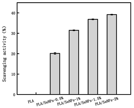 DPPH free radical scavenging activity is often used to evaluate the antioxidant activity of specific compounds or food items []. The higher the DPPH free radical scavenging rate, the greater the antioxidant activity. As shown in Figure 6, a significant increase was noted in the DPPH radical scavenging activity of PLA/SeMP films with SeMP concentrations of 0.5–2% (p < 0.05), indicating that the antioxidant property of the composite membrane was gradually enhanced. The pure PLA film does not show any antioxidant properties: thus, the antioxidant property of the composite membrane arises from SeMPs. When the concentration of SeMPs in the composite membrane was 2%, the antioxidant activity reached the maximum value of 39.15% ± 0.01%. This confirmed the antioxidant activity of SeMPs.
