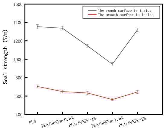 The seal strength is a key index used to evaluate the quality of packaging materials []. Due to the addition of SeMPs, the composite film, a smooth surface was formed on one side and a rough surface on the other on the smooth glass plate. After careful observation, it was determined that the side of the pure PLA film close to the glass plate was smoother than the other side, farther away from the glass plate. Figure 7 displays the sealing strengths of the pure PLA and PLA/SeMP composite membranes.