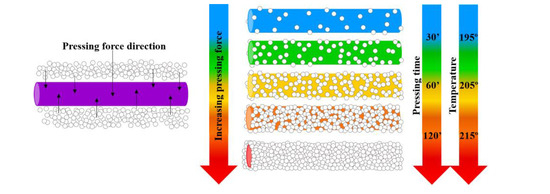 The increased temperature of 215 °C drastically influenced the final mass of the obtained materials. A significant increase in the core-shell materials’ mass with a PLA polymer base was recorded. As the exposure time and pressing force increased, their mass increased proportionally, up to 200% values (see Figure 8C).