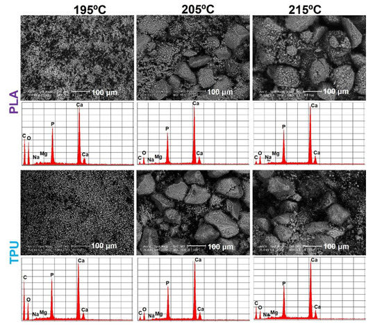Preliminary morpho-compositional characterization of polylactic acid (PLA) and thermoplastic polyurethane (TPU) polymer coated with hydroxyapatite (HA) particles at 195, 205, and 215 °C.